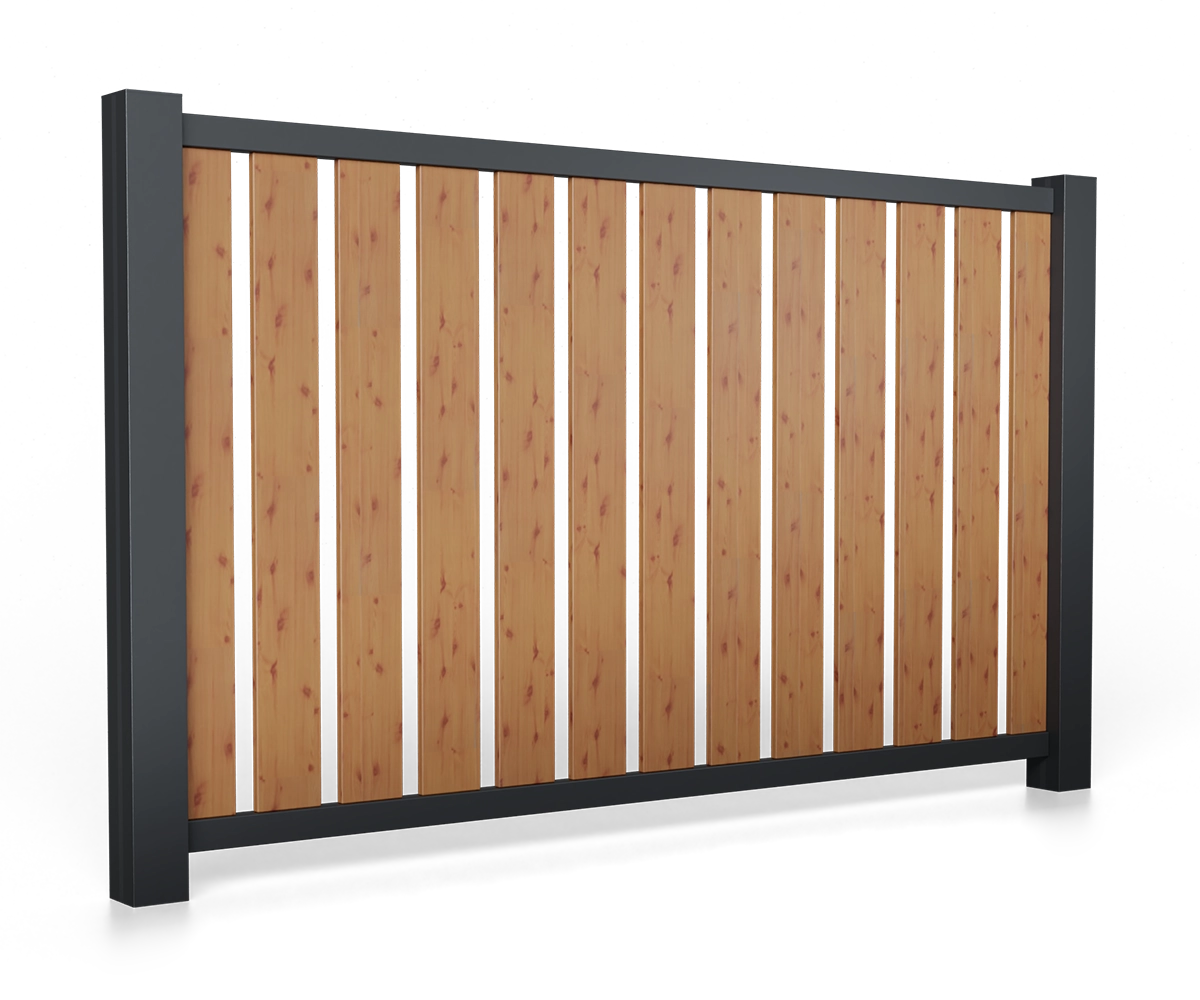 Kompletne, przygotowane do samodzielnego montażu aluminiowe przęsło wypełnione aluminiowymi pionowymi profilami w dowolnym wzorze drewnopodobnym. Aluminiowe przęsło ogrodzeniowe w nowoczesnej minimalistycznej formie, która wpasuje się zarówno w nowoczesną, jak i tradycyjną architekturę. Wyróżniająca estetyka i wykonanie w technologii bez spawania dopracowane w każdym szczególe.  Przęsło produkowane z aluminium będącego materiałem o bardzo wysokiej odporności na korozję i niekorzystne warunki atmosferyczne.