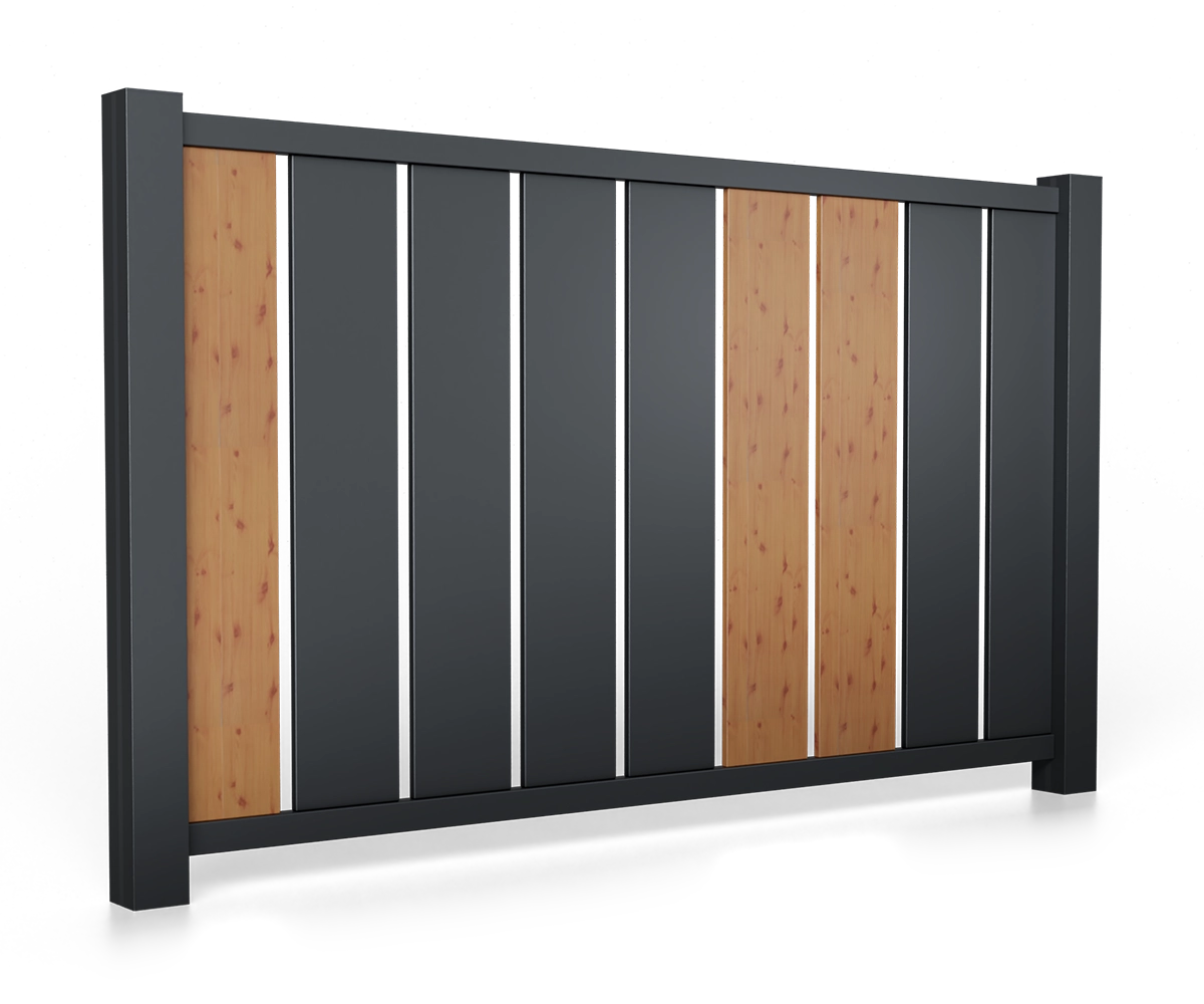Ogrodzenie produkowane w technologii bez spawania w całości z aluminium malowanego proszkowo na dowolny kolor z palety RAL oraz w kolorach drewnopodobnych.