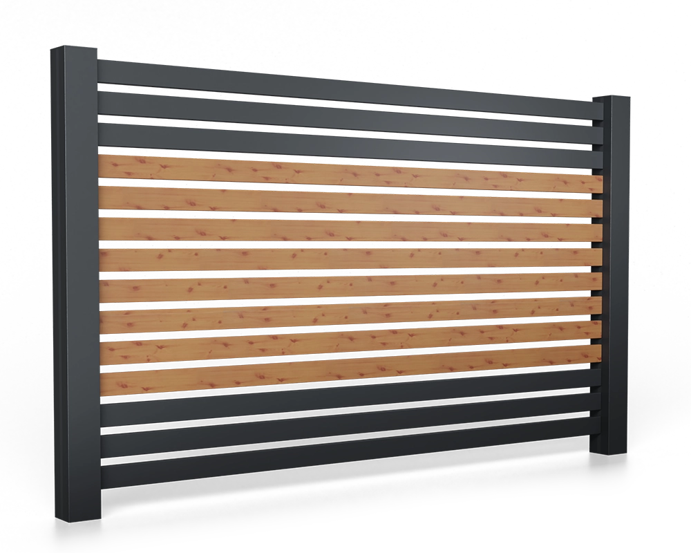 Kompletne, przygotowane do samodzielnego montażu aluminiowe przęsło wypełnione aluminiowymi poziomymi profilami w dowolnym kolorze z palety RAL z detalem w dowolnym wzorze drewnopodobnym. Aluminiowe przęsło ogrodzeniowe w nowoczesnej minimalistycznej formie, która wpasuje się zarówno w nowoczesną, jak i tradycyjną architekturę. Wyróżniająca estetyka i wykonanie w technologii bez spawania dopracowane w każdym szczególe.  Przęsło produkowane z aluminium będącego materiałem o bardzo wysokiej odporności na korozję i niekorzystne warunki atmosferyczne.