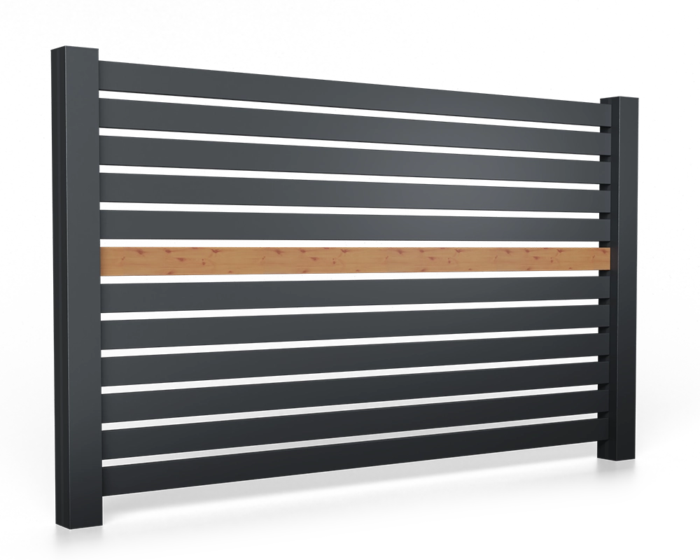 Kompletne, przygotowane do samodzielnego montażu aluminiowe przęsło wypełnione aluminiowymi poziomymi profilami w dowolnym kolorze z palety RAL z detalem w dowolnym wzorze drewnopodobnym. Aluminiowe przęsło ogrodzeniowe w nowoczesnej minimalistycznej formie, która wpasuje się zarówno w nowoczesną, jak i tradycyjną architekturę. Wyróżniająca estetyka i wykonanie w technologii bez spawania dopracowane w każdym szczególe.  Przęsło produkowane z aluminium będącego materiałem o bardzo wysokiej odporności na korozję i niekorzystne warunki atmosferyczne.