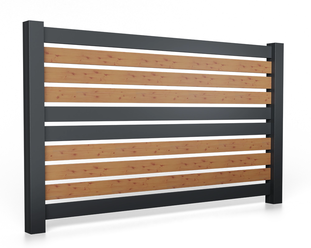 Ogrodzenie produkowane w technologii bez spawania w całości z aluminium malowanego proszkowo na dowolny kolor z palety RAL oraz w kolorach drewnopodobnych.