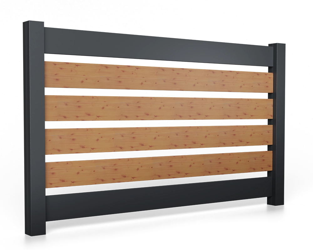 Ogrodzenie produkowane w technologii bez spawania w całości z aluminium malowanego proszkowo na dowolny kolor z palety RAL oraz w kolorach drewnopodobnych.